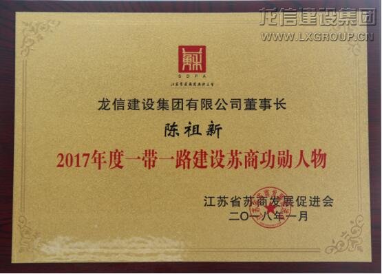 1月19日,由江蘇省蘇商發(fā)展促進(jìn)會(huì)主辦的“2018年(第12屆)蘇商領(lǐng)袖年會(huì)暨2017年蘇商人物系列推選頒獎(jiǎng)典禮”在南京隆重舉行。龍信集團(tuán)董事長(zhǎng)陳祖新榮獲“2017年度一帶一路建設(shè)蘇商功勛人物”稱(chēng)號(hào)。