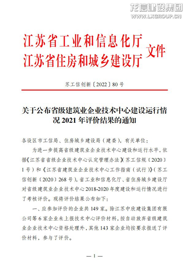 近日,江蘇省工業和信息化廳、江蘇省住房和城鄉建設廳印發《關于公布省級建筑業企業技術中心建設運行情況2021年評價結果的通知》(蘇工信創新〔2022〕80號),龍信集團獲2021年江蘇省建筑業企業技術中心“考核優秀”的評定。本次共有149家企業參評,15家企業技術中心評價結果為優秀。