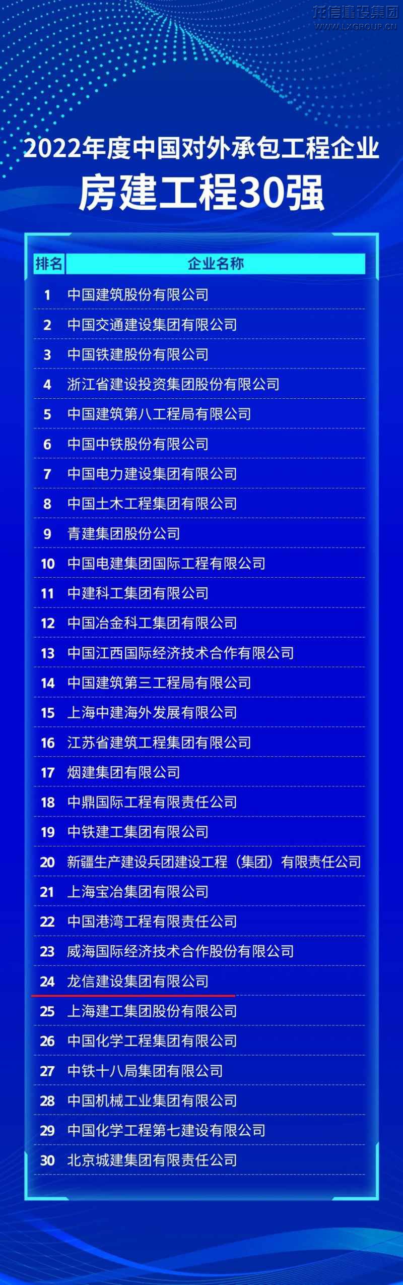 龍信建設集團有限公司榮登中國對外承包工程百強榜單,房建工程30強榜單,彰顯了公司在國際工程承包領域的實力和影響力,凸顯了公司在海外市場高質量發展的核心競爭力。
