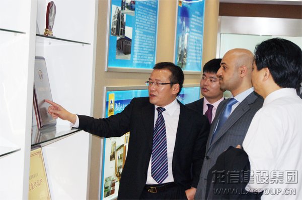 東恒盛大酒店午餐后,客人們不顧旅途勞累,饒有興趣地分別觀摩了別具一格的龍馨園小區、龍馨家園樣板房、集團公司精裝房各類建筑材料超市、遠程視頻控制室、業績展示廳。當他得知達曼雙塔項目施工現場實時畫面也在寬大的屏幕上展現時,他份外欣喜,連聲稱道。他時而緩步、時而駐足在業績展示大廳的獎杯、獎狀、證書前細細欣賞。他通過譯員稱贊集團公司的輝煌業績令人敬佩!對雙方日后更加緊密廣泛的合作充滿了信心。走到展示廳門口邊,阿仆杜拉先生欣然灑脫地在電子屏幕上簽名留念。