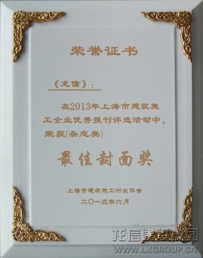 在2013年度上海市建筑施工企業優秀報刊的評選中我公司《龍信》雜志獲評“優秀”獎和“最佳封面”獎,“最佳封面”獎只有包括《金螳螂》在內的3家企業雜志獲評,這次獲獎是繼2012年獲得上海市、江蘇省、國家行業協會獎項后的再次獲獎。