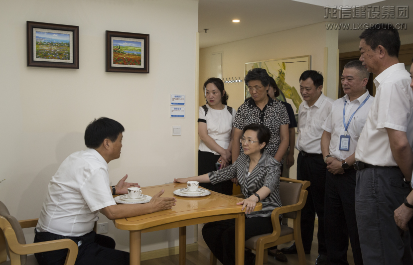 調研組一行在陳祖新董事長等人的陪同下實地察看了龍信樂頤薈老年公寓的整體環境及配套設施,先后參觀了樂頤薈閱覽室、養老用品體驗館、醫務室、龍信康養展廳、護理區及樣板房。