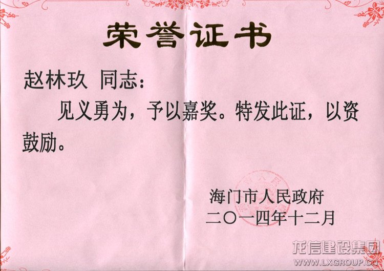• 龍信集團趙林玖獲市“見義勇為”表彰 [2014-12-27]